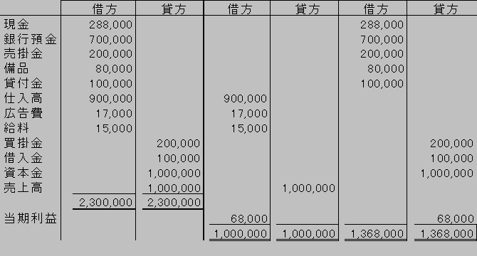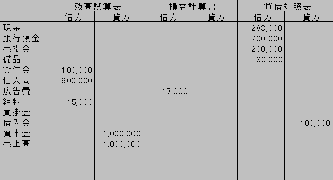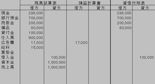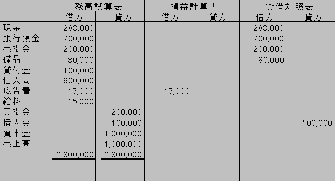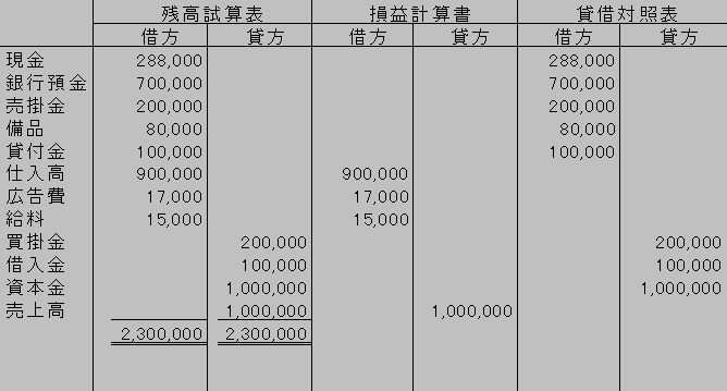 を記載する。同様にして貸借対照表の借方の合計と貸方の合計を求め、その差額を利益または損失として求める。